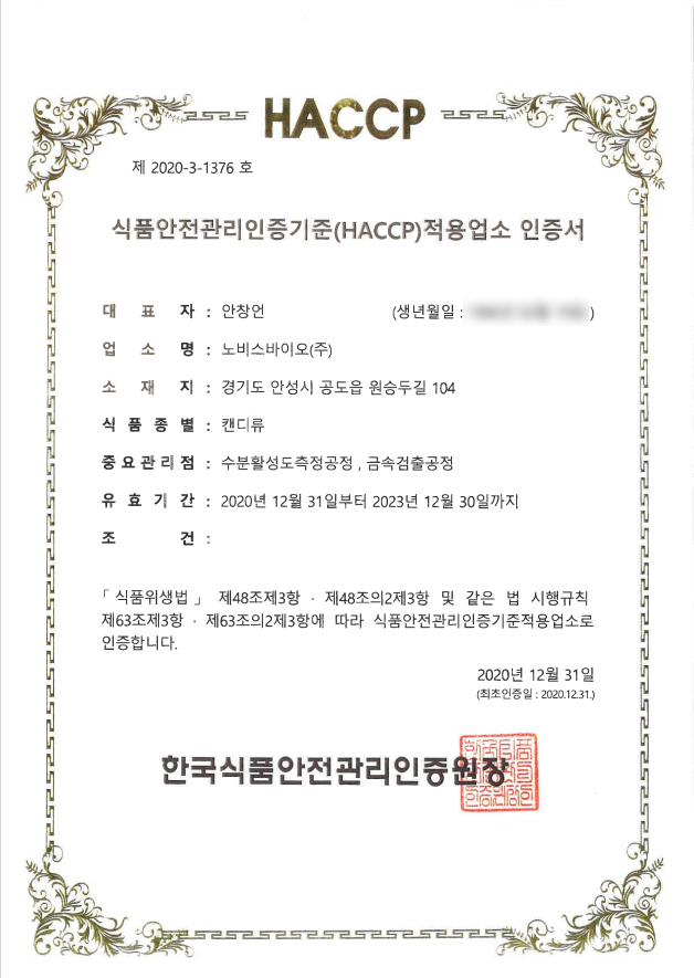 HACCP 인증서 (캔디류)