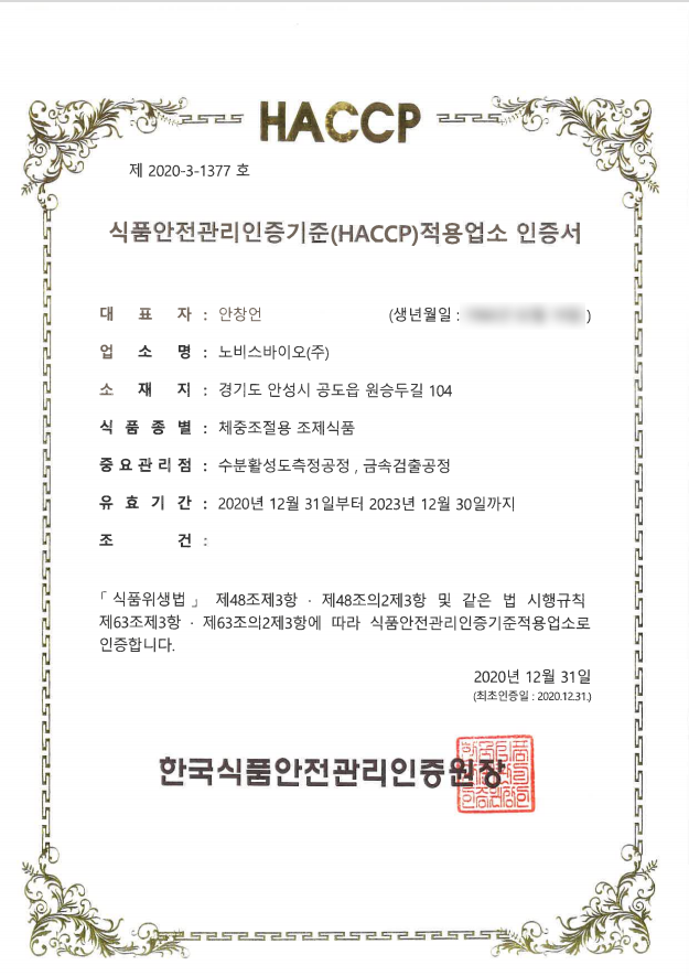 HACCP 인증서 (체중조절용 조제식품)