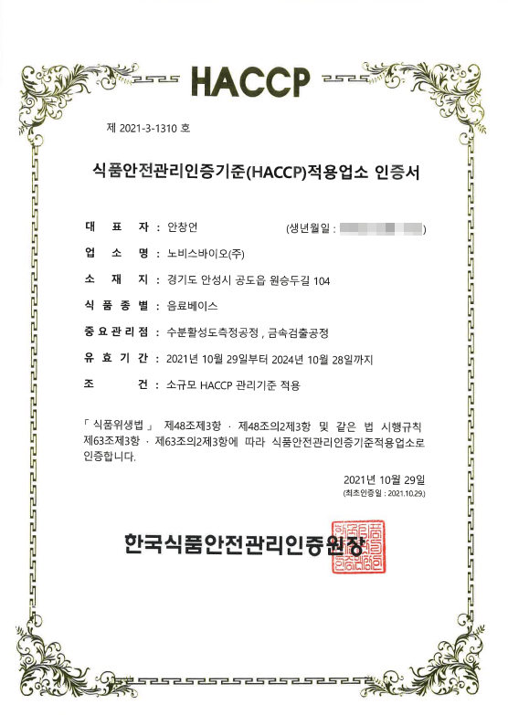 HACCP 인증서(음료베이스)